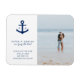 Nautiskt foto spara datum magneter med lodrät bild på högerna. På den lämnat sidan finns ett marint blåankare med monogrammet på vardera sidan. Nedan står namn och ord, "är gifter sig", över en vit bakgrund. Det här är perfekt för ett badbröllop på sommaren.