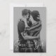 Med ett foto på ett enda lodrät och ett modernt skript skrivet "spara datumet" är det här kortet perfekten för att meddela din förlovning och kommande bröllop till vänner och familj. Den vita texten är djärv och modern men fortfarande sofistikerad. Anpassadet på framsidan har plats för namn, datum, plats och annan information, t.ex. en webbplats i bröllop. Baksidan är ett svart och vitt strippat mönster. Det svarta färg kan redigeras genom att klicka på Anpassa.