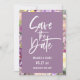 Modern, vitt skript och lila vattenfärgen blommigt ram, Bröllop spara datum fotokort. Funktioner, chicens dammiga lavender färg-bakgrunder och en fotomall på baksidan.