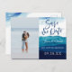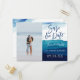 Modern och roligt kalligrafi Spara datumet med vattenfärgen vinkarare och tvättar, med vackra nyanser av marin, djupblå, ljusblå. Konsten liknar oceanen vinkar eller bergen. Ljusblå vattenfärgsfläckar på baksidan.
