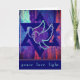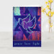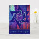 David med två fredsduvor i centrum. Stjärnan är en safir blå mörk och dovarna är lätta akvor. Bakgrunden är en storartad blandning av rik färg, inklusive aqua, turkos, safir, lila och briljant ro red. Bilden ser ut att ha ett väteliknande utseende, ge kortet en känsla av struktur och djup. Insidan av hälsning lyder: Med varmt önskemål i Hanukkah för fred i ditt hem, i ditt hjärta och i hela världen. Lycklig Hanukkah! Lägg enkelt till ditt namn under det förinställda hälsning eller lägg till ditt eget hälsning. En underbar blå stjärna av David är på den lämnat insidan. Uppdatera året på baksidan.
