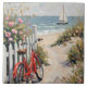 A retro red bike leaning against a white picket fence surrounded by pink flowers on a sandy path leading to the ocean. The beach is empty, but you can see a pretty blue sailboat with a white sail on the water.