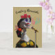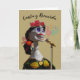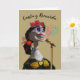 Dia de los Muertos, hälsningskort för Day of the dead med pappert skelett för hondjur figur med mikrofonsång. Hon är försedd med röd ros, ett gigantiskt band och en guld accenterad klänning. Täck meddelandet "Sjunga och Kom ihåg" och inuti meddelandet "Det finns mer tid än liv". Art, bild och versell copyright © Shoaff Ballanger Studios, 2022.