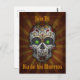 Fira Day of the dead, Halloween eller andra höstevenemang med detta unika vykort som kan användas som inbjudan. På framsidan finns en illustration av en traditionell sockerskalle med glanande kalkgrönt ögon, det är dekoration färgad i nyans eller rost, orange, kol, grått, tan och kalkgrönt. Skallen ställs mot en spooky grunge sol-bakgrund i rost och gyllene gult. Text (som kan ändras och personlig) står "Gå med oss" och "Dia de los Muertos". På baksidan finns mallar där du kan ställe anpassningsbarna med händelseinformation. Mittdelen av en sockerskalle och löv grenar kan flyttat till vilken plats som helst eller tas bort om så önskas.