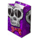 Lila faux glitter-gnistor bakom döskallarna för svartvitsocker. En feminin skalle med ruby Red bow är på sidan av presentsäcken. Å andra sidan har en maskulinsockerskalle en glatt röd bukhinna. Toppen söt! Roligt!