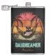 Daydreaming Coola Cats Tropical Escape Hip-kolv: En svart katt med solglasögon och en hawaiisk skjorta, som sitter i en hammock mellan två handflatan träd, med ett regn i bakgrunden.