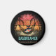 Daydreaming Coola Cats Tropical Escape Circle magnet: En svart katt med solglasögon och en hawaiisk skjorta, som sitter i en hammock mellan två handflatan träd, med ett regn i bakgrunden.