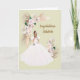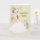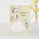 Debutante-kort med en illustration av ett ungt dam i en vit grattis med vackra ro som omger henne. Framsidan är permanent, men inre ord kan ändras. Tack vare Hungryjpeg för en del av inslag i designen.