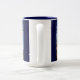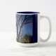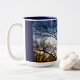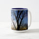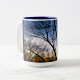 Grenarna av en trädräckvidd in i blå himmel på en kristall - klar dag på en mugg av blått och guld. En perfekt gåva för några som älskar naturen. Mugg.