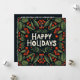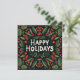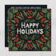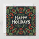 Minimalist holiday card design with a Scandinavian-inspired theme. The card features a simple green and red color palette, with intricate, stylized illustrations of holly berries and abstract plants, arranged in a harmonious and balanced layout around a central text box. The central box has a clean, modern font with the message "Happy Holidays" The design evokes a natural, festive feel with elegant, hand-drawn details, capturing a modern yet timeless aesthetic.