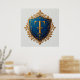 Onaturligt designad örtsköld med en gyllene brev T omgiven av intrikata guld-präglingar på blå botten. Elegantens detaljer väcker frågor om tradition, royalty och sofistikering.