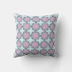 A decorative pillow featuring a symmetrical geometric pattern with blue, white, and brown hues shown from the front and back on a gray background.