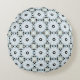 A decorative pillow featuring a symmetrical geometric pattern with blue, white, and brown hues shown from the front and back on a gray background.