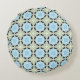 A decorative pillow featuring a symmetrical geometric pattern with blue, white, and brown hues shown from the front and back on a gray background.