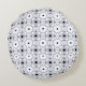 A decorative pillow featuring a symmetrical geometric pattern with blue, white, and brown hues shown from the front and back on a gray background.