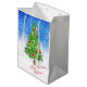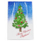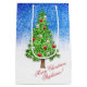 Dekorerad Julgran under snö glatt blå och vit bakgrundspåse Gift. Anpassade God jul-meddelande. Vackert trendig Julgran med grönt och bruna gnistor, dekorerat med skuggande, rött och genomskinligt vitt. (glitter-effekten simuleras inte på riktigt.)