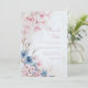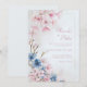 Set a sophisticated and unique tone for your celebration with this stunning botanical frame. This design features delicate clusters of classic pink cherry blossom paired with striking, deep blue sakura petals. These vibrant floral branches arch gracefully along the left border and bottom corner, set against a crisp white background. A thin, elegant gold rectangular frame encloses the center, providing a polished and modern boundary for your details. The high-contrast color palette and fine-art botanical detail create a romantic, high-end atmosphere for your special news. This modern botanical layout is an impeccable choice for a romantic spring wedding or a sophisticated garden ceremony. It pairs beautifully with themes like modern organic, fine-art botanical, or moody romance, coordinating flawlessly with gold metallic accents and deep navy or blush pink linens.
