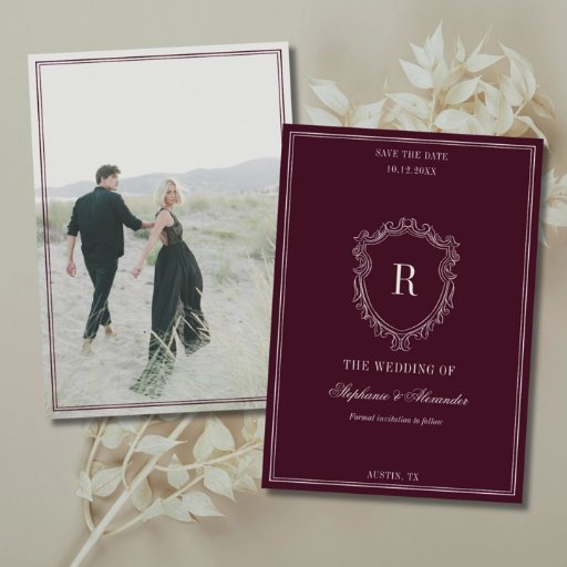 Announce your wedding with timeless sophistication using this Burgundy & Ivory Monogram Crest Old Money Photo Wedding Save the Date, a refined two-sided design that blends classic elegance with a romantic personal touch. Created for couples who value tradition, heritage style, and understated luxury, this save the date sets the tone for a beautifully curated celebration.