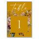 Förstora mottagningsdecorren med den här snyggten med ett djup senap gult bordsnummer-kort för bröllop, med romantiska blommigtar för vattenfärg och kalligrafi för elegant. Perfekt för boho-, rustik- eller fallbröllop, det här bord-kortet hjälper gästerna att hitta sina platser med lätthet. Bakgrunden till den fet senapsbakgrunden (även kallad marigold eller saffron guld) parar vackert med terracotta, sage, och jordisk gult. Perfekt för höstmottagningar.