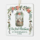 Elegant Calligraphy Script, Vår första jul som morföräldrar Watercolor Winter Blommigt Hjort Ornament innehåller röda poinsettias, vit blommigt ro, gräs, bomullskonger och vintergrej. Watercolor Mason burk med hjort-familjen i gräs-skogen. Foto bakåt.