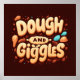 En vit och lekfull design med texten "Dough and Giggles" i ett seriöst teckensnitt med en ljus, lekfull färg. Den övergripande sammansättningen är lätt och lockande, vilket väcker en känsla av glädje och skratt.