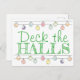 Skicka det här dekoret till Halls-julets vykort för prydnadsfärger på jultomten till dina vänner och din familj. Julfrasen "Deck the Halls" i grönt accentuerades med färggrann jul lökar. Låt den här festen Julhälsningar ge lite glädje.