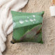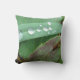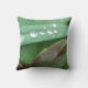 Einige grosse Wassertropfen auf einem breiten, grünen Grashalm sind am oberen Rand dieses American MoJo Dekokissens zu sehen. In der unteren rechten Ecke ist ein von einem Hölzchen dorchstochenes, rot-braunes Blatt.