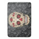 Röd rosblomman dekorerade den matta skallebadrumbadmattan eller kök. Skallen dekoreras med röd ros, löv, vines och nyckelpigaögon. Blom- skallebakgrund. Dag om den döda mexicanska skallekonsten.