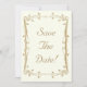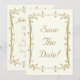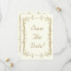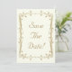 Vacker och elegant antik guld spara datum bröllopskort mall design med dekorativa bladrika rullar runt kanten. Designen har en elfenbensfärgad bakgrund för en elegant vintage look. Denna design finns också på många andra pappersprodukter och även porto för att passa alla dina bröllopssatsbehov.