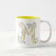 Dekorativ mugg för konst för Monogram för hand plockadeversal M. Den nätt hand plockade klottrade designen som presenterar hjärtor och blommor. Unik typografisk konst och design för © av Sarah Trett. www.sarahtrett.com för www.mylittleeden.com på zazzle