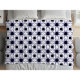 Handdukar och en tvättlapp har ett geometriskt mönster med marinblå stjärnor och cirklar på vit bakgrund, vilket ger en modern och sofistikerad look.
