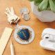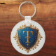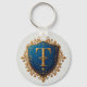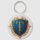 Konstfullt utformad heraldisk sköld med en gyllene bokstav T omgiven av invecklad guldförgyllning på blå bakgrund. Elegant detalj frammanar teman som tradition, kunglighet och sofistikering.