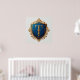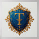 Konstfullt utformad heraldisk sköld med en gyllene bokstav T omgiven av invecklade gyllene utsmyckningar på en blå bakgrund. Elegant detalj frammanar teman som tradition, kunglighet och sofistikering.