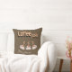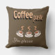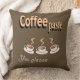 Dekorativ kudde, med titeln Koffepasta, en rolig Coffee Copy Paste Pun, med en kopia av tre kaffe koppar och ett "yes pet" begär en bruna bakgrund i grund