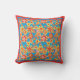 En Dekorativ kudde eller Cushion med ett överkant mönster av rött, orange, gula blommor på en ljus turkobakgrund, från ett handmålat pappert kollage av Judy Adamson.