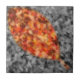 Ett selektivt höstfoto i färgaden av fallna kräpmyrtelösa löv, med en guld-framtagen löv-form av klarrött, orange och gult mot en svart och vit bakgrund.