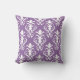 Dekorativ dekorativ kudde med ett purpurfärgat damastast mönster. Handgjort i USA. Stor bomull kudder med en damastast design för vintage i vit på en purpurfärgad bakgrund.