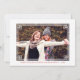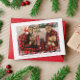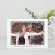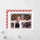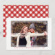 Julkort där du kan lägga till ditt eget foto i en tryckt vit ram med en geometrisk design. Lägg till era namn, julhälsning och året också med röda bokstäver. Baksidan har ett rött och vitt rutigt mönster.