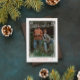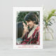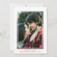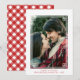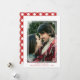 Julkort där du kan lägga till ditt eget foto i en tryckt vit ram med geometrisk design. Lägg till era namn, julhälsning och året också med röda bokstäver. Baksidan har ett rött och vitt rutmönster.