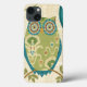 © Veronique Charron/vild Apple. Ett dekorativt avbildar av en uggla, och cirkuläret mönstrar och planlägger. Bakgrunden är en solbränd kulör blommönster.