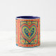 En ringsignal mugg med en mörk blått fälg och handtag och en dekorativ hjärtdesign i rött, blått, grönt och guld från en vattenfärgsmålning av Judy Adamson.