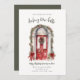 Dekorera Nya Hallar, flyttmeddelande julkort. Festlig röd akvarelldörr med juldekoration.