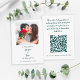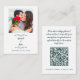 Enkel, elegant och chic informationskort för bröllop med minimalistisk design i smaragdgrön ton på vit bakgrund och en mall för ditt personliga förlovningsfoto. Kortet ber dina gäster dela speciella fotominnen från er bröllopsdag genom att skanna QR-kod eller ladda upp direkt till er webbplats. Anpassa brölloppsdesignen med parets förnamn och bröllopsdatum på framsidan tillsammans med en modern skannbar QR-kodmall för er webbplats. För bästa resultat med denna design, ladda ner er QR-kod som PNG-fil med transparent bakgrund för att undvika en vit ruta runt koden. Beskära gärna er QR-kod om den inte redan är beskuren innan uppladdning för bästa passform. Använd meddelandelänken eller mejla invitationsuites@gmail.com om ni har frågor om denna design eller har förfrågan om anpassad färg.