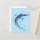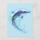 En levande digital avbildning av en delfin visas stiga graciöst mot en akblå bakgrund. Delfinen lyser med iriserande färger och är omgiven av stiliserade vattenstänk som förstärker dess dynamiska rörelse.