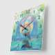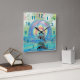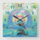 2 delfiner som simmar i hav nära en härlig resning av färger och vatten med 2 planet, en måne och en färgrik sol. Rosa-, blått-, aqua-, gult- och gröntfärger i vatten och himmlen.