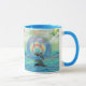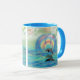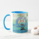 2 delfiner som simmar i hav nära en härlig resning av färger och vatten med 2 planet, en måne och en färgrik sol. Rosa-, blått-, aqua-, gult- och gröntfärger i vatten och himmlen.