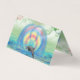 2 delfiner som simmar i hav nära en härlig resning av färger och vatten med 2 planet, en måne och en färgrik sol. Rosa-, blått-, aqua-, gult- och gröntfärger i vatten och himmlen.