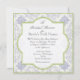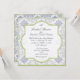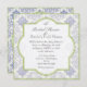 Denna vintageinspirerade bröllsamling har en komplett ensemble av produkter. Denna design består av ett detaljerat vintageutskuret etsande mönster som har gjorts till bakgrunden. Den har en toile damask-känsla. Den mjuka limegröna kanten på en quatrefoil-central design och yttre kant ger den en samtida essens och oförutsägbarhet. Konsten målades under antiken och omarrangerades till en tilltalande färgpalett och layout. En vacker blå fransig iris, glömmignej, vita hortensior och förtjusande små vita och svarta fjärilar fullständigar bilden.