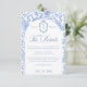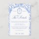 Delft blue floral wedding details card, designed in a refined blend of chinoiserie and French toile de Jouy style. The soft botanical illustrations frame an arched layout featuring an elegant wedding crest monogram, perfect for couples who love vintage, historic, and European-inspired aesthetics. Classic script typography pairs beautifully with the ceramic-blue palette, making this design an effortless nod to the tradition of “something blue.” Fully customizable with your names, date, and location, it’s an exquisite choice for any romantic or sophisticated wedding theme.