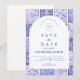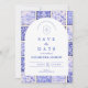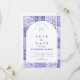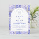 A timeless blue and white design inspired by classic Delft porcelain and French toile patterns. The patchwork tile border combines delicate florals, stripes, and ornamental motifs that evoke vintage European ceramics. A soft arched panel in the center keeps the layout refined and elegant while allowing the details of the porcelain-inspired pattern to frame the celebration beautifully. Perfect for couples planning a sophisticated blue and white wedding with traditional European charm.